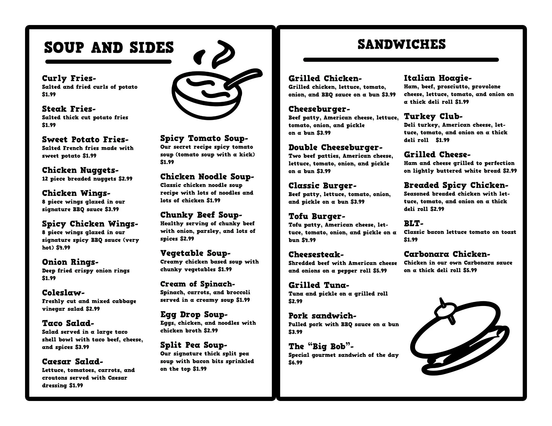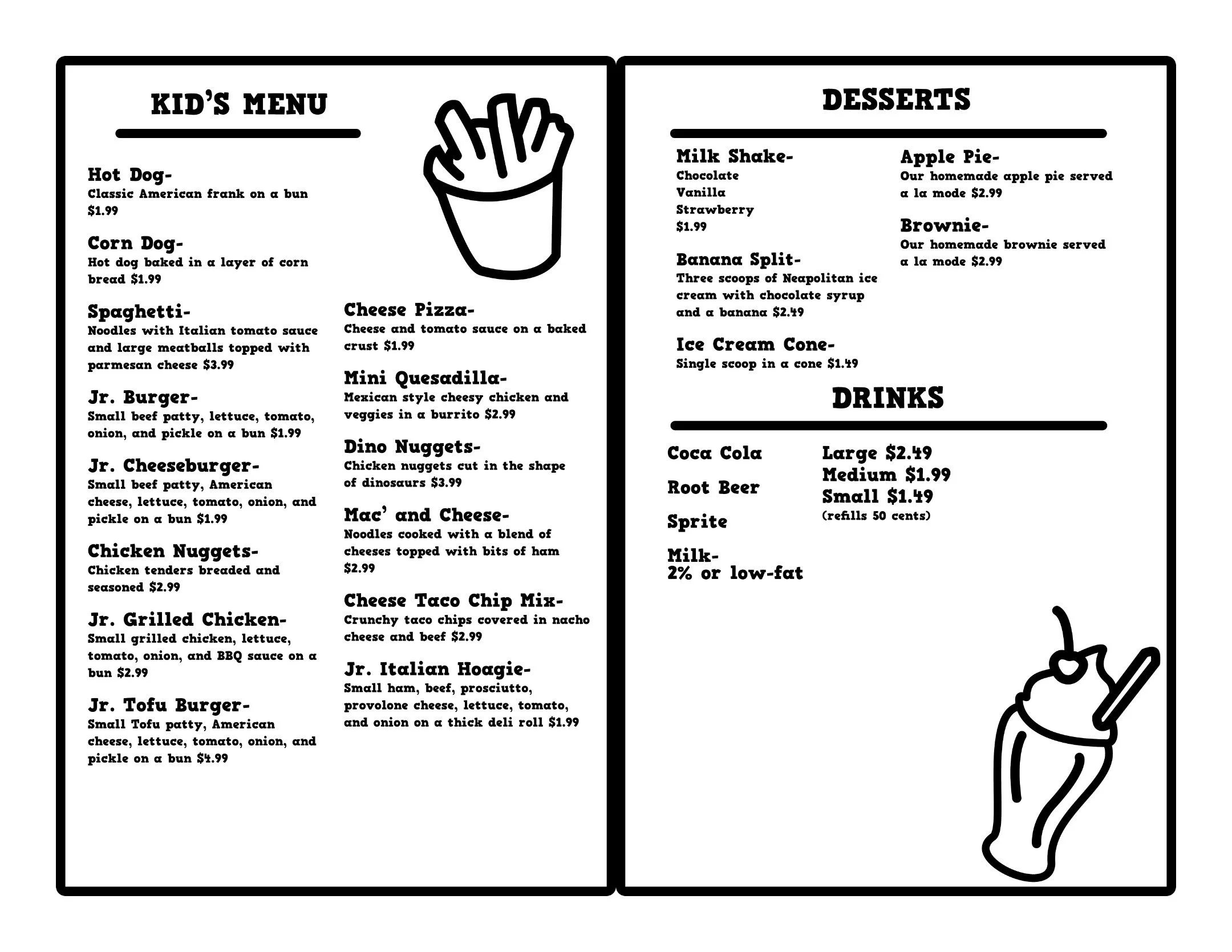 I created this fast casual dining take out menu for a small mom and pop restaurant. The intent was to have a design that is modern and minimalist while still evoking the feeling of a 1950's burger shop.